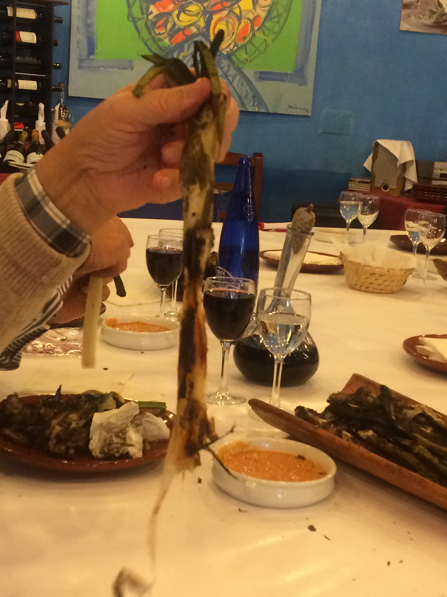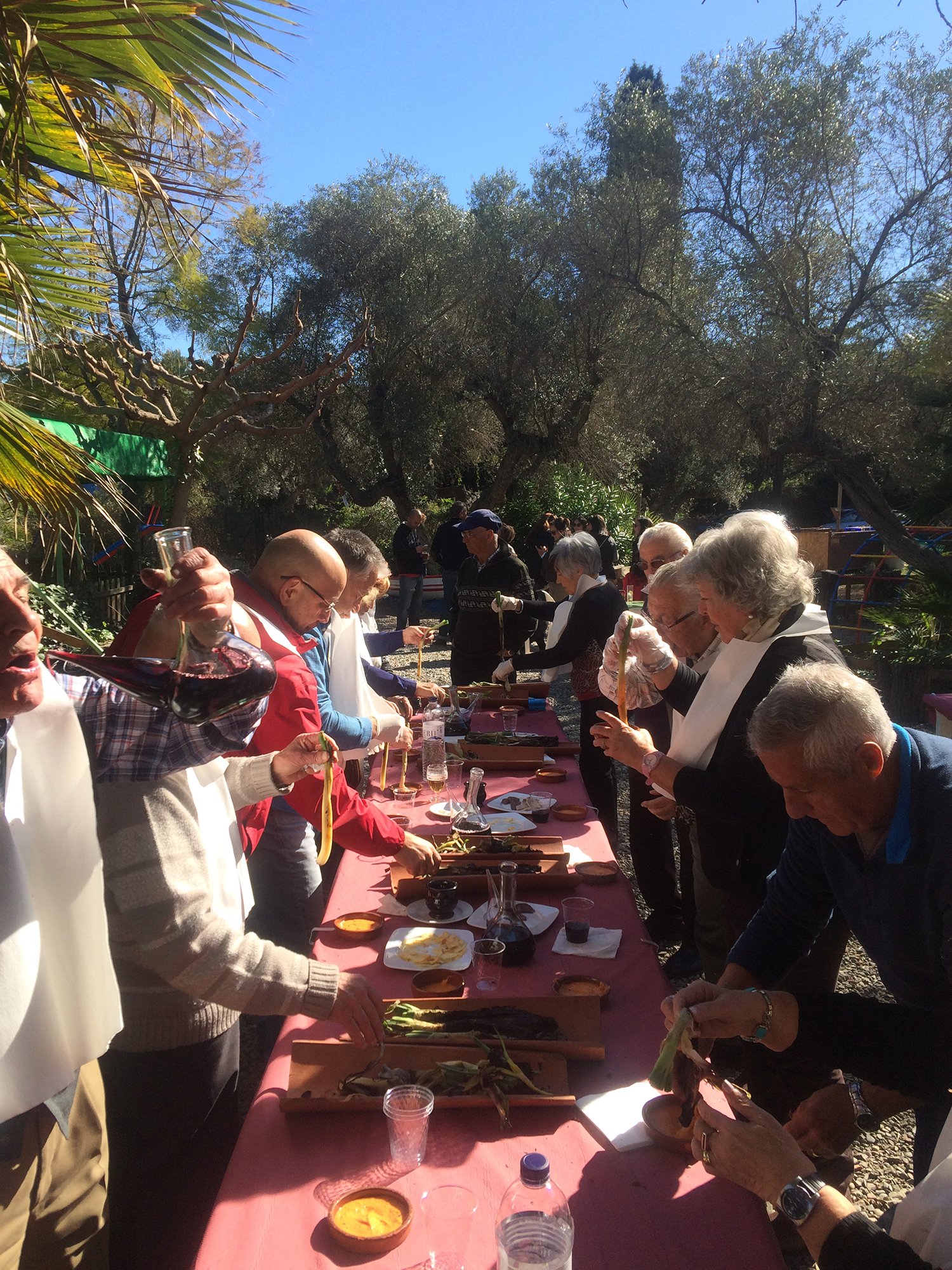 Man äter upp till 20-35 calçots per person. Sedan tar man vara på elden och steker korv och kött och kronärtskocka att äta efter calçotsen.